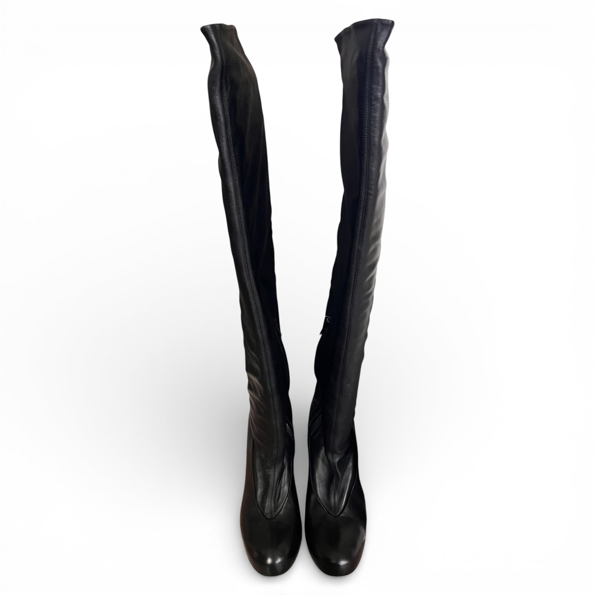 Bottes hautes en cuir lisse, montant jusqu’au genou, avec possibilité d’un léger effet plissé selon le porté.