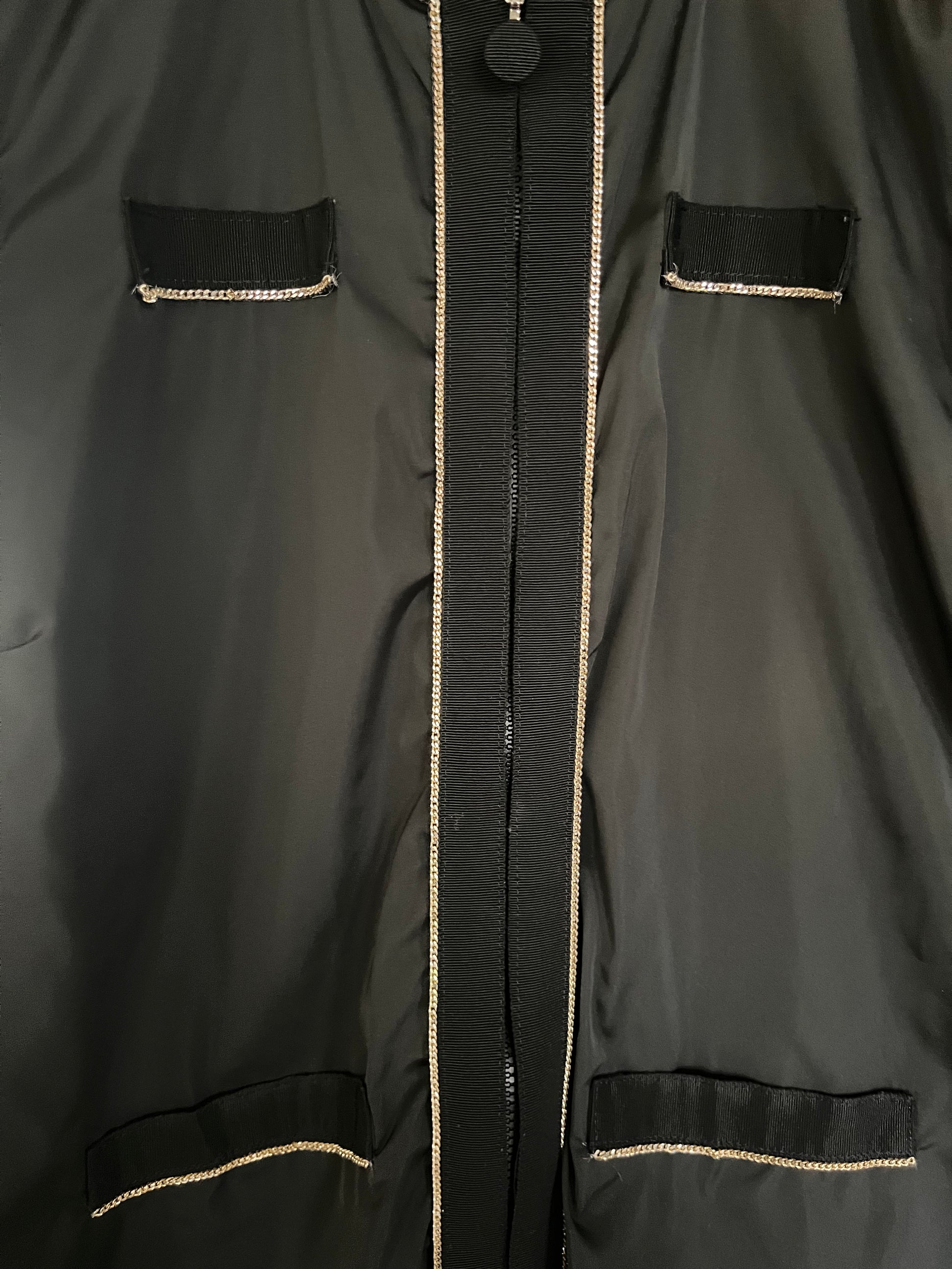 Finitions chaînettes argentées sur le col, l’ouverture et les poches